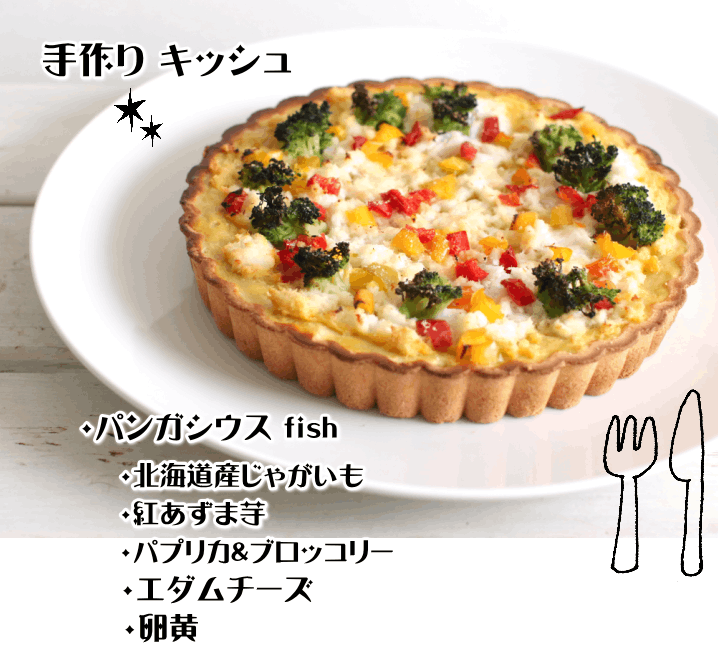 白身魚にアレルギーのある子も安心な、アレルギー対応の美味しいパンガシウスFishをたっぷりと贅沢に、北海道産ポテト、国産紅あずま芋、パプリカ、ブロッコリー、エダムチーズ(ツヤだしに卵黄)と具だくさんのパティシエの手作りキッシュ♪秋限定で【おいしいクッキー】のかぼちゃのお顔をトッピング♪