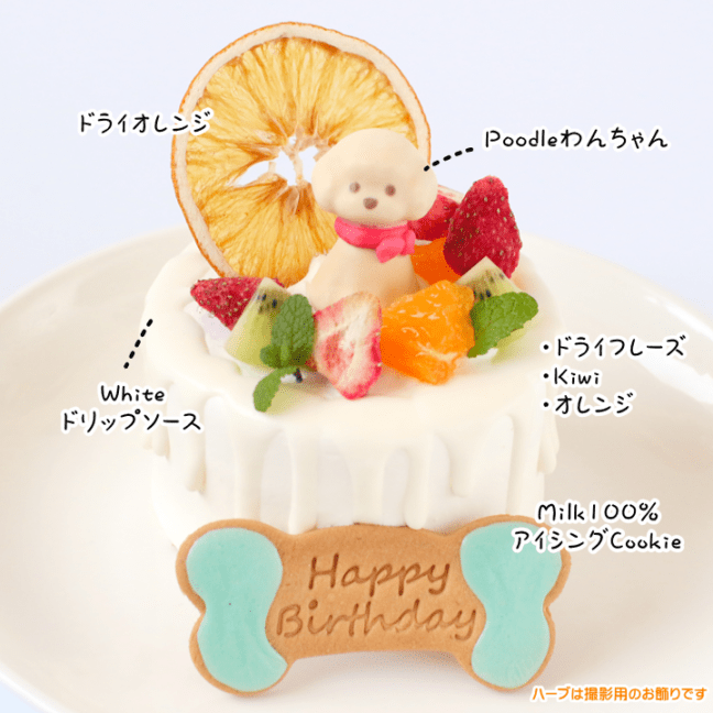 ふわふわスポンジとクリーム、美味しいフルーツがたまらないっ☆可愛いわんちゃんのお飾りと北海道産脱脂粉乳100%でお作りしたこだわりのアイシングクッキーはピンクとブルーからお選びいただけます♪